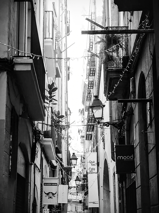 The vertical perspective leads the eye through a labyrinth of ancient stone and Mediterranean balconies, highlighting the unique blend of history and contemporary culture that defines the Ciutat Vella. The stark black and white finish emphasizes the dramatic interplay of light and the rich textures of the centuries old facades.