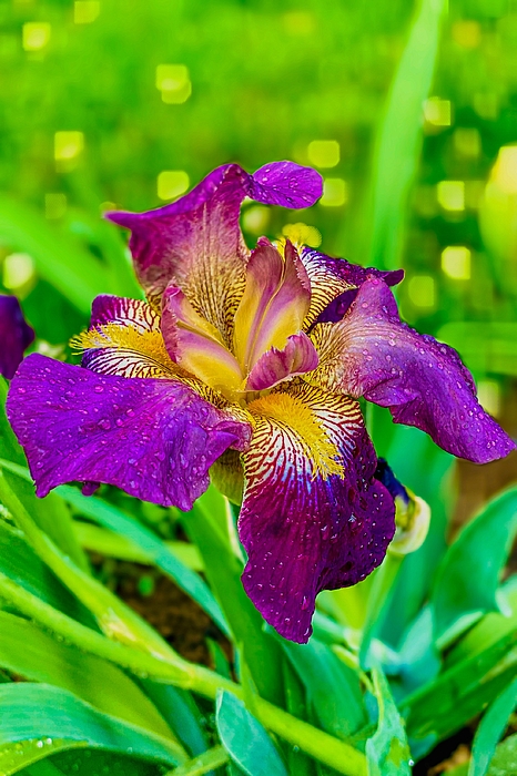 A vibrant purple iris stands out with its detailed petals covered in dewdrops against a lush green background. Captured in sharp focus, the flower... more