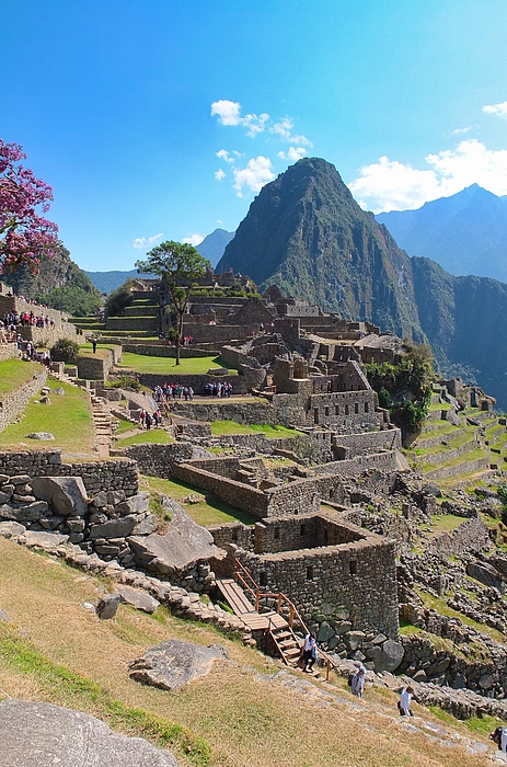 Ancient stone structures and terraces stand prominently against the backdrop of a towering, lush green mountain. Tourists can be seen exploring the ruins, which bask in the warm sunlight under a clear blue sky.