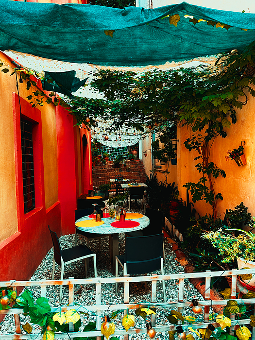 A quaint outdoor dining area features vibrant painted walls in red and yellow hues. The space is enhanced by hanging plants and a shaded awning, creating a cozy, intimate atmosphere.