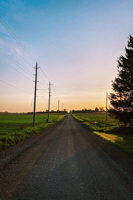 A dirt road stretches into the distance flanked by power lines and green fields under a dusk sky. The setting sun casts a warm glow over the scenery,... more