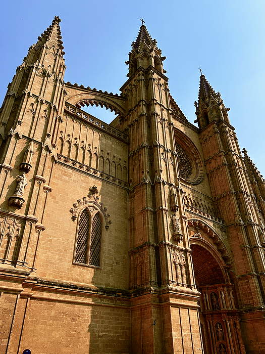 This striking photo captures the magnificence of Palma de Mallorca's iconic cathedral, known locally as La Seu. As a stunning example of Gothic architecture, the cathedral's facade stands as a testament to centuries of history, with notable interventions by the renowned architect Antoni Gaudí. The building is famous for its towering structure, intricate stonework, and the world's largest Gothic rose window, earning it the nickname "the Cathedral of Light." It is a must-see landmark that beautifully overlooks the Mediterranean Sea. The towering structure showcases intricate gothic architecture with tall spires and detailed carvings. Warm tones highlight the grand facade under a clear blue sky.