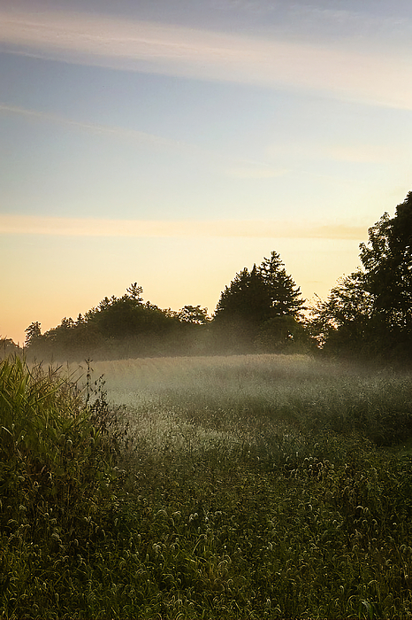 The gentle rays of the sunrise filter through a misty landscape, casting a soft glow over a meadow and the surrounding trees. The tranquillity of early morning is captured with the dew-laden grass and the hazy, golden light suggesting the start of a new day.
