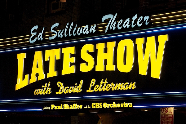 Bright neon signs light up the facade of the Ed Sullivan Theater, advertising the "LATE SHOW with David Letterman" alongside mentions of Paul Shaffer and the CBS Orchestra. The signage glows against the dark nighttime background, highlighting the iconic nature of the television show venue.