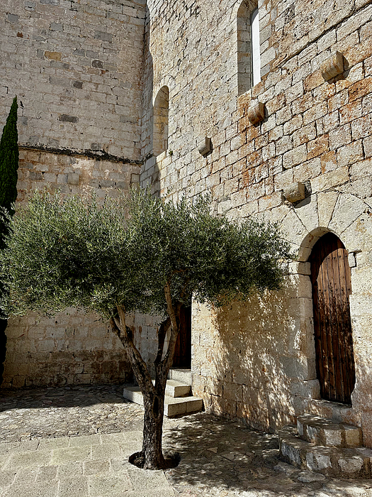 A classic Mediterranean scene within the ancient courtyard of Peñíscola's Papa Luna Castle. A gnarled olive tree stands as a testament to time, casting dappled shadows on the sun-drenched stone walls. The photograph captures the rustic charm and historic atmosphere, with a series of arched doorways and stone stairs leading into the fortress's depths, creating a timeless and inviting composition. A solitary olive tree stands in front of a rustic stone wall, casting soft shadows on the ground. The wooden doors and arched windows add to the historical ambiance.