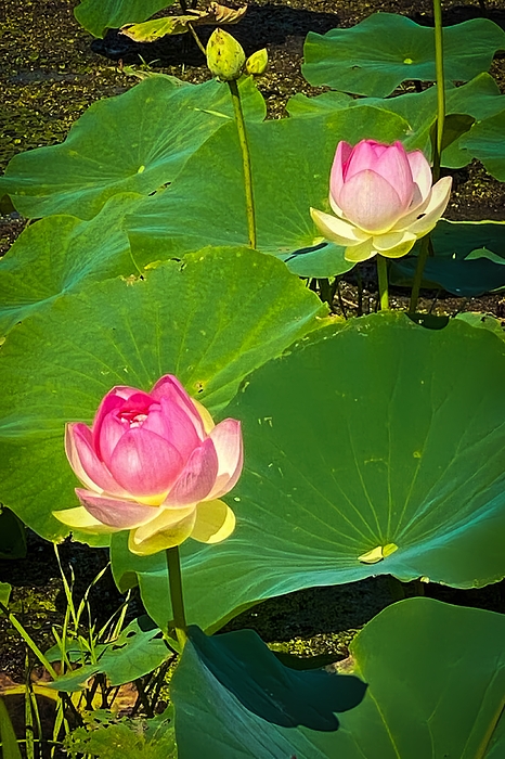 Two vibrant pink lotus flowers bloom among large green lily pads under bright sunlight. A lotus bud stands tall near the blossoms, promising yet... more