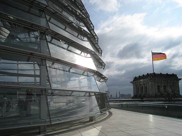 Sunlight reflects off the glass facade of a modern building with a curved design, while visitors can be seen walking inside through the transparent layers. In the background, a historic stone building overlooks the scene, with a German flag fluttering proudly under a cloudy sky.