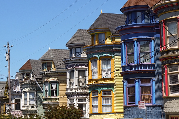 Victorian-style houses, also known as Painted Ladies, line up along a street, showcasing their distinctive architectural features and colorful facades. These classic structures are adorned with ornate detailing and are typical in certain historic neighborhoods.