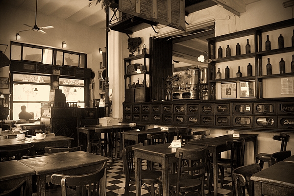 A sepia-toned photograph captures the nostalgic ambiance of a traditional café with wooden furniture and checkered floor tiles. Vintage decorative... more