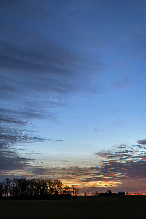 A serene twilight sky showcases a gradient of blues and warm tones near the horizon, where the sun has recently set. Below, the silhouette of a tree line and a faint outline of a building punctuate the landscape's profile.
