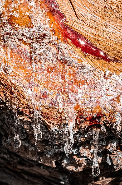 Glistening sap drips from the trunk of a freshly cut tree, capturing the sunlight and creating an almost amber-like appearance. The rich, warm tones... more
