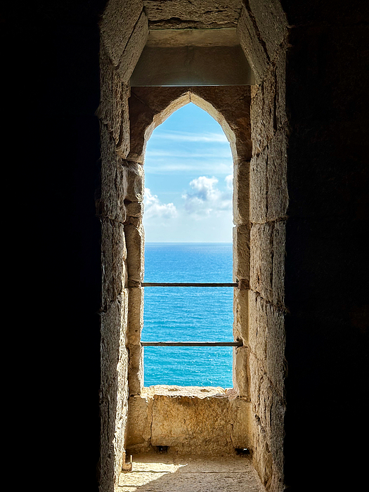 A mesmerizing view from the "writing room" window of the historic Papa Luna Castle in Peñíscola. The ancient stone walls frame a breathtaking vista of the deep blue Mediterranean Sea and a bright, cloud-filled sky. This photograph captures the timeless beauty and a sense of solitude, inviting you to imagine the thoughts and words that may have passed through this very window centuries ago. A stone archway frames a breathtaking view of the ocean, with a vibrant blue sea and scattered clouds. The rustic texture of the stones contrasts beautifully with the serene seascape.