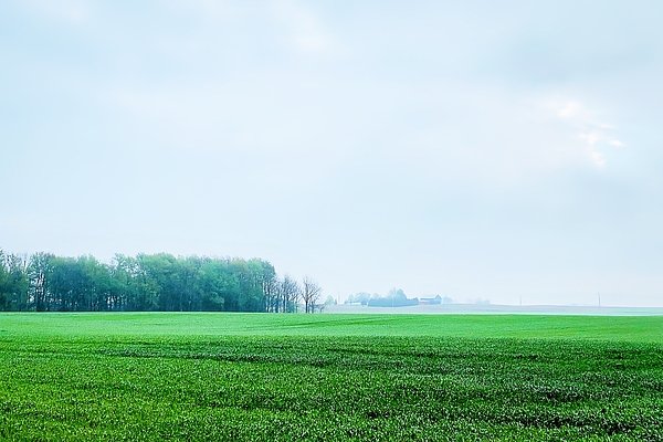 A vast green field stretches out under a hazy sky, with a line of trees breaking the horizon. It appears to be a calm day with the overcast sky... more