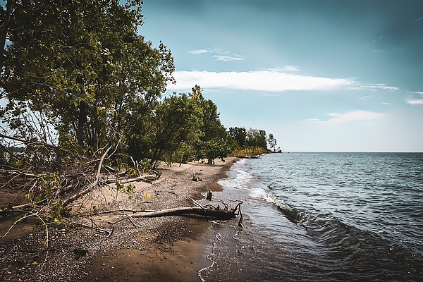 Gentle waves lap against a sandy shore with trees edging right up to the waterline. A few driftwood pieces are scattered along the beach, adding to... more