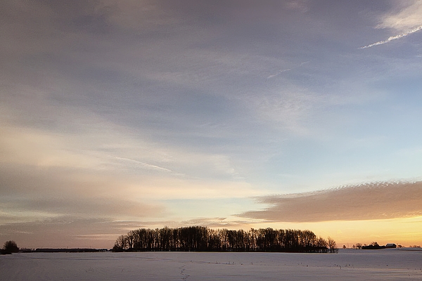 A tranquil winter scene unfolds as the sun sets, casting a warm glow on the horizon behind a copse of leafless trees. The foreground is covered with... more