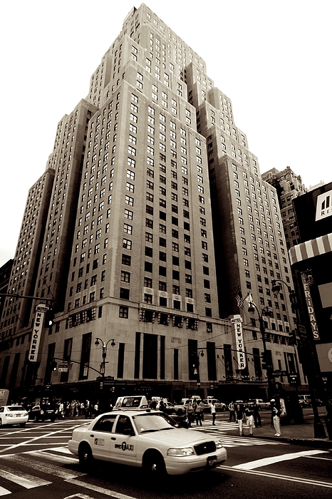 A towering building looms large in the frame, capturing the essence of urban architecture with its numerous windows and tiered structure. In the foreground, a taxi cab is prominently positioned on the street, hinting at the bustling city life.