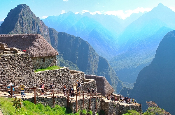 Perched high above a verdant mountain valley, ancient stone structures with thatched roofs overlook a breathtaking view of peaked mountains under a bright blue sky. Tourists flock along a narrow pathway, bordered by a simple wooden fence, to experience the wonder of the historic site.