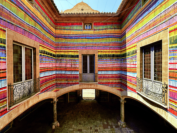 This striking photo captures the central courtyard of the historic Casal Balaguer in Palma de Mallorca, transformed by a vibrant, temporary art installation covering the walls in horizontal, rainbow-colored stripes. The dramatic artwork sharply contrasts with the palace's classical architecture, including its stone archway and wrought iron balconies, highlighting its contemporary role as a dynamic cultural center. A vibrant courtyard features walls adorned with horizontal stripes of various colors. The architecture includes ornate balconies and a traditional archway, creating a blend of modern and traditional design.